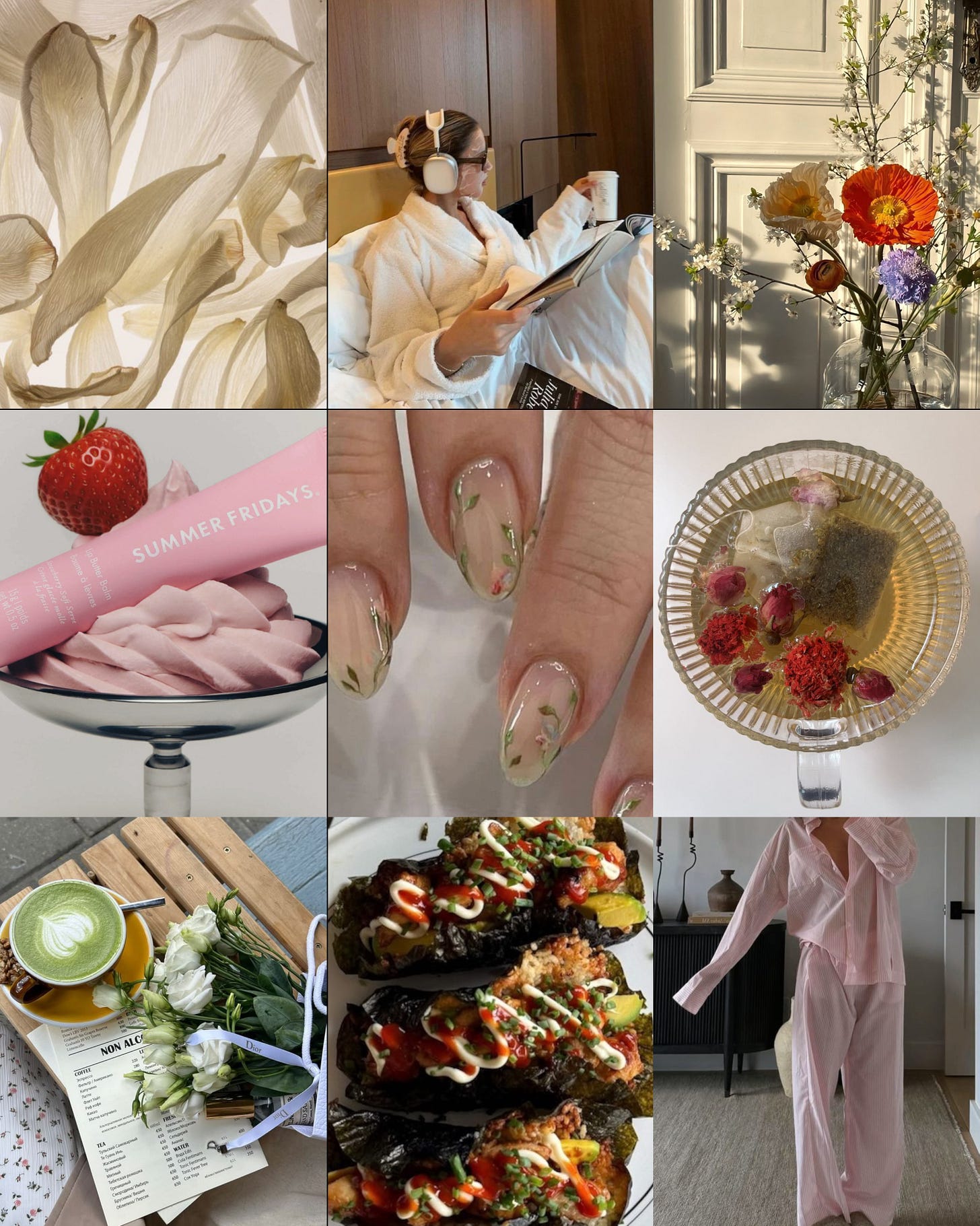 Slow early mornings, reading in bed, giving yourself enough time to get ready for the day. Matcha on the patio. Abstract floral nails. Lippies in your bag (Summer Fridays’ strawberry soft serve has me in a chokehold, in a duo with birthday cake).